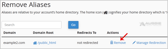 Under "Remove Aliases", locate the parked domain name and click on the "Remove" link.