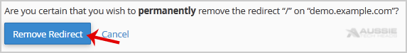 3. Scroll down to the end of page and under "Current Redirects" locate the domain and click on the "remove" icon.