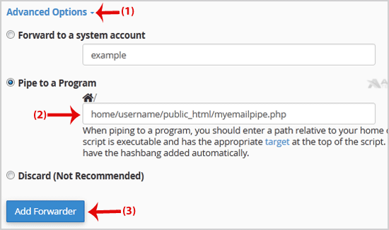 1. If you want to forward your email to an e-mail pipe script like myemailpipe.php, which is located on your public html folder like "/home/username/public_html/myemailpipe.php", follow Step 2 and Step 3.