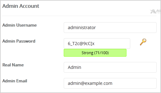 8. Under the "Admin Account" field enter the following information: