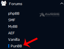 4.  On the left side of your screen you should locate the "Forums" category. Click on it and then click on the "PunBB" link that will appear.