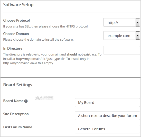 - In Directory: If you want to install this in a directory, for example example.com/forum, enter the directory name. Otherwise, leave this blank to install in your main domain example.com