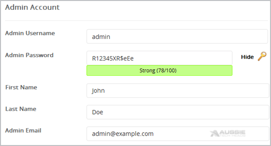 8. Under the "Admin Account" field enter the following information: