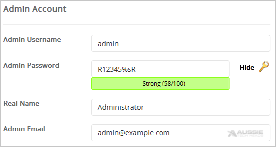 8. Under the "Admin Account" field enter the following information: