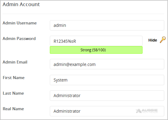 7. Under the "Admin Account" field enter the following information: