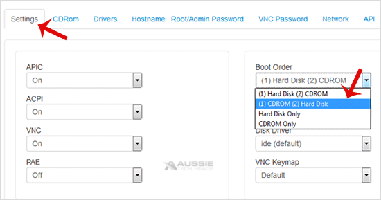 3. Scroll down, and under the "settings" tab, change the Boot Order to "(1) CDROM (2) Hard Disk".